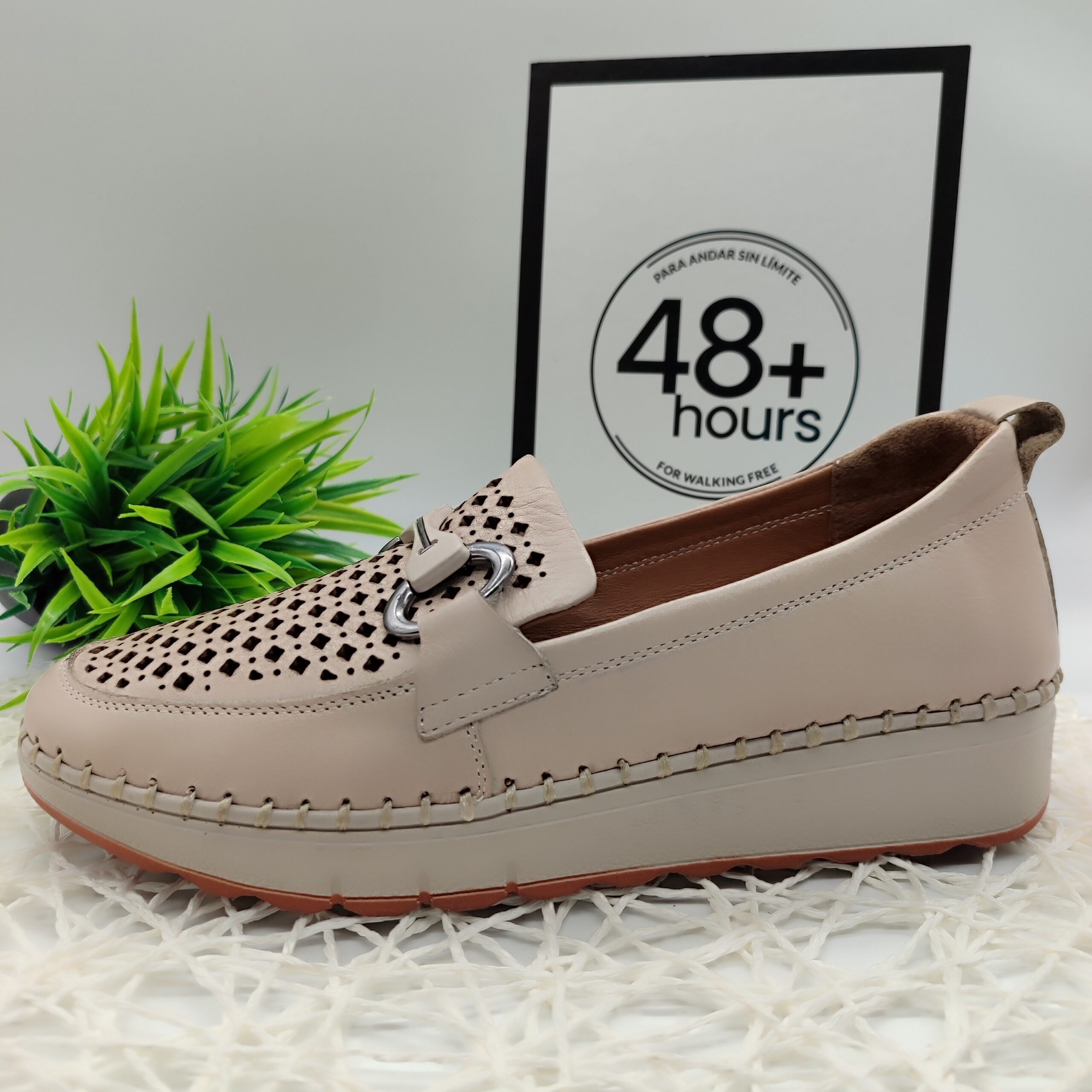 Mocasín piel crema de la marca 48 + hours, diseñado para un uso prolongado y comodidad al caminar. Este tipo de calzado se caracteriza por su parte superior de piel troquelada o perforada, que permite una mejor transpirción, y una suela de cuña ligera que ofrece soporte adicional.